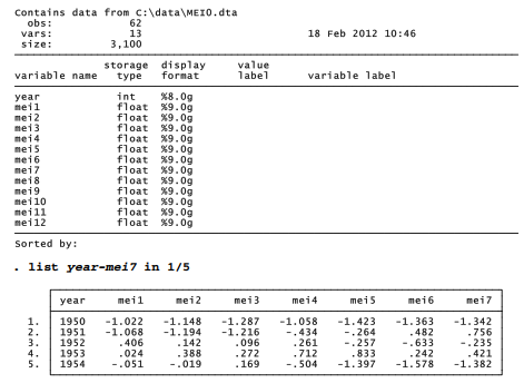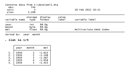 We can reshape these wide-format data into a time series in long format. The following command names a new variable to be created, mei. Each row of the new long-format dataset will have an observation identifier, i(year), and sub-observation identifier, j(month).