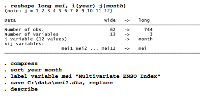 A different sort of restructuring is possible through the reshape command. This command switches datasets between two basic configurations termed wide and long. Earlier in this chapter we built a dataset with the Multivariae ENSO Index (MEIO.dta). The data are in wide format: years define the rows, but each month is a separate column. Thus, meil represents the MEI value for January, mei2 is February, and so on.