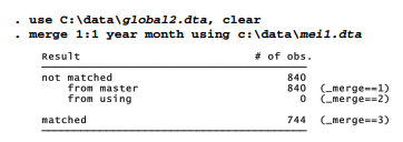 Now we have the Multivariate ENSO Index time series in year/month form, similar to the year/month time series of global surface temperatures (global2.dta) we built earlier. With both datasets sorted by year and month, we can merge the two into a common file.