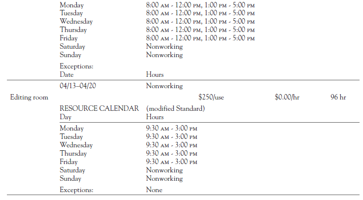 After the project plan was developed, the PM confirmed the availability of each required resource, and obtained schedules for each. MSP allows the PM to create an individual availability calendar for each resource on the project. From these calendars, resource schedules are automatically generated, and Table 6-2 shows the schedules for several of the required resources. (Any resource not shown in Table 6-2 works a 5-day week, 8:00 am to 5:00 pm with an hour off for lunch, usually 12 pm-1 pm, without exceptions during the period of the project.) Among other things, the PM noted the following: