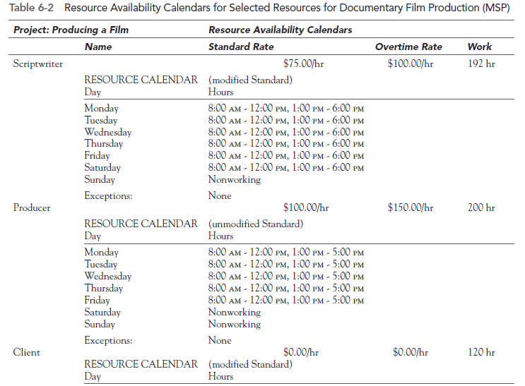 After the project plan was developed, the PM confirmed the availability of each required resource, and obtained schedules for each. MSP allows the PM to create an individual availability calendar for each resource on the project. From these calendars, resource schedules are automatically generated, and Table 6-2 shows the schedules for several of the required resources. (Any resource not shown in Table 6-2 works a 5-day week, 8:00 am to 5:00 pm with an hour off for lunch, usually 12 pm-1 pm, without exceptions during the period of the project.) Among other things, the PM noted the following: