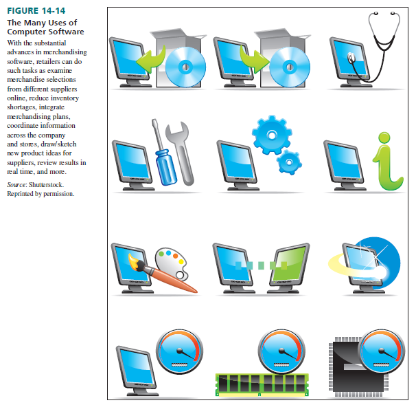 One of the most significant advances in merchandise planning is the widespread availability of computer software that gives retailers an excellent support mechanism to systematically prepare forecasts, try various assortment scenarios, coordinate data for category management, and so forth. In an era when many retailers carry thousands of items, merchandising software is a part of everyday business life. See Figure 14-14.