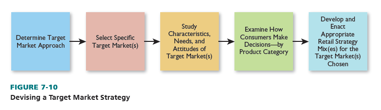 After choosing a target-market method, the retailer selects the target market(s) to which it wants to appeal; identifies the characteristics, needs, and attitudes of the target market(s); seeks to understand how its target customers make purchase decisions; and acts appropriately. The process to devise a target market strategy is shown in Figure 7-10. Next, we present several examples of retailers’ target-market activities.