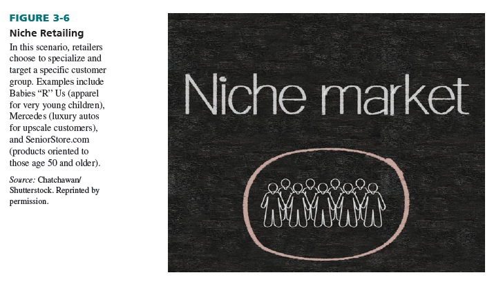 In niche retailing, retailers identify specific customer segments and deploy unique strategies to address the desires of those segments rather than the mass market. Niching creates a high level of loyalty and shields retailers from more conventional competitors. Babies “R” Us appeals to parents with very young children, whereas Catherines Stores has fashions for plus-size women. A niche retailing approach will have a strong future because it lets retailers stress factors other than price and have a better focus. See Figure 3-6.
