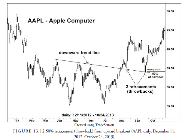 For example, consider the price movement pictured in Figure 13.12. Obviously, the principal trend for AAPL (Apple Computer) from late June is upward. However, from mid-August through mid-September, prices are trending downward in a countertrend, retracing a portion of the price gain. This retracement halts, as is often the case, at the downward trend line established before the upward trend began. Such a retracement is called a throwback and is an excellent level at which to participate in the upward trend. Not all retracements are as large. In early August, for example, a small throwback occurred right after the upward breakout through the trend line. A small throwback retracement such as this is also quite typical action after an upward breakout.