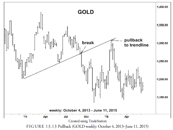 Variations of retracements that occur after a breakout, usually from a horizontal support or resistance zone but sometimes from a trend line, are called pullbacks or throwbacks depending on whether the breakout was downward or upward. When the price retraces quickly back to the breakout zone from an upward breakout, it is called a throwback, and conversely, the quick retracement from a break downward is called a pullback (Edwards and Magee, 2007). Figure 13.13 shows a pullback in the gold market. These retracement variations will become more important when we discuss chart patterns, but they often are found in any breakout, especially in one from a rectangle formation or congestion area. These retracements may not abide by normal retracement percentages if they are blocked by the support or resistance level from which they broke. They tend to be very short in time and distance but often provide a second, lesser-risk opportunity for a breakout trader to enter a position.