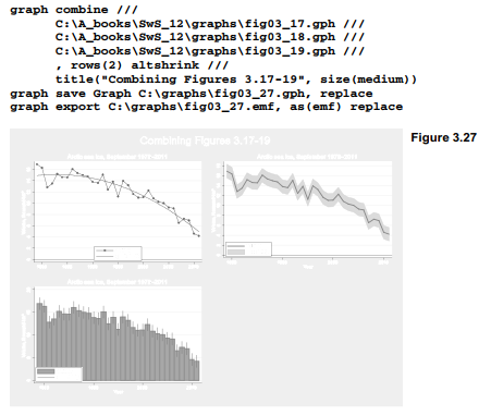 The do-file below (saved as fig03_27.do, then run by typing do fig03_27) combines Figures 3.17, 3.18 and 3.19 from this chapter. The /// indicates a command continued on the next physical line, as described earlier. The final combined image is saved as Figure 3.27.