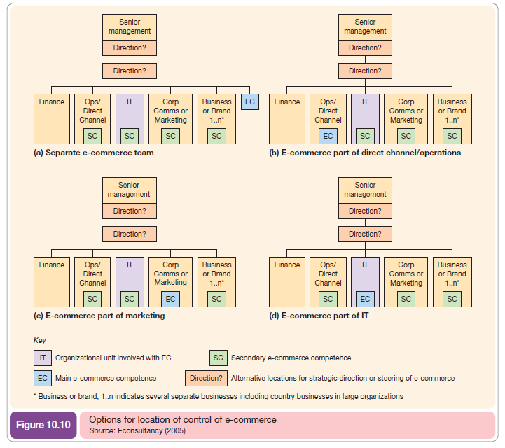 There is also often one or several secondary areas of e-commerce competence and resource. For example, IT may have a role in applications development and site build and each business, brand or country may have one or more e-commerce specialists responsible for managing e-commerce in their unit. Consider which of the options would be preferable for organizations you are familiar with, such as your college or university or companies you have worked with. The research suggested that the approach which was appropriate depended strongly on the market(s) the company operated in and their existing channel structures.
