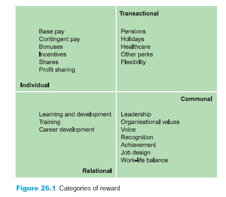 For the most part we will be focusing in this Part of the book on transactional or tangible rewards, by which we mean those which are financial in nature. But it is important to remember that employees also value the intangible (or relational) rewards which they gain from coming to work, to all of which we have made extensive reference in earlier chapters. These include opportunities to develop both in terms of career and more generally as a human being, the social life which is associated with working in communal settings, recognition from managers and colleagues for a job well done and for the effort expended, and more generally from a sense of personal achievement. Increasingly the opportunity to work flexibly so as to achieve a better ‘work-life balance’ is discussed in this context too (see Chapter 31). The trend towards viewing reward policies and practices as extending well beyond the realms of payment has led to widespread interest in the concept of ‘total reward’ which involves managers viewing the way that they reward employees in the round, taking equal account of both the tangible and intangible ingredients that together help to make work and jobs ‘rewarding’ in the widest sense of the word. The idea is effectively illustrated in graphical form by Armstrong and Brown (2006, p. 25) in their model adapted from work by the Towers Perrin reward consultancy (see Figure 26.1). Here four distinct categories of rewards are identified, the implication being that each has equal potential significance as a source of reward from the employee perspective.