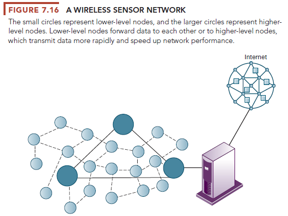 If your company wanted state-of-the art technology to monitor building security or detect hazardous substances in the air, it might deploy a wireless sensor network. Wireless sensor networks (WSNs) are networks of interconnected wireless devices that are embedded in the physical environment to provide measurements of many points over large spaces. These devices have built- in processing, storage, and radio frequency sensors and antennas. They are linked into an interconnected network that routes the data they capture to a computer for analysis. These networks range from hundreds to thousands of nodes. Figure 7.16 illustrates one type of wireless sensor network, with data from individual nodes flowing across the network to a server with greater processing power. The server acts as a gateway to a network based on Internet technology.