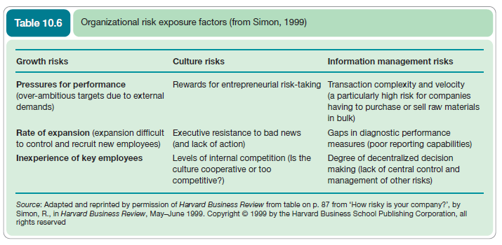 As an alternative view of risks with a wider organization context, Simon (1999) presents a simple risk calculator based on different types of risks faced at a company level (Table 10.6). This calculator can be usefully applied to e-business change or a high-growth dot-com company since significant change may accentuate these risks.