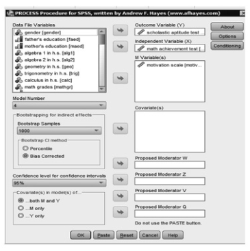 Next, we need to run the analysis. With PROCESS, all of the regressions will be run at the same time and we will be able to assess if motivation mediates the relationship between math achievement and scholastic aptitude test – math. To do this, be sure you have loaded the PROCESS .spd program, then follow the steps below: