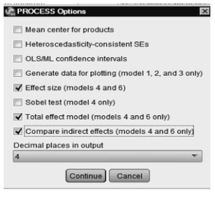 - Click on Options, click on Effect size (models 4 and 6), Total effect model (models 4 and 6 only), and Compare indirect effects (models 4 and 6 only). (See 7.2.)