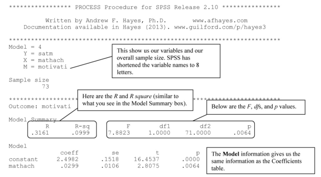 The first part of the output reports the variables: the dependent variable (Y) is scholastic aptitude test – math, the independent variable is math achievement, and the mediating variable (M) is motivation. Next we see the overall sample size is 73, therefore two participants did not have data for one or more of the variables.