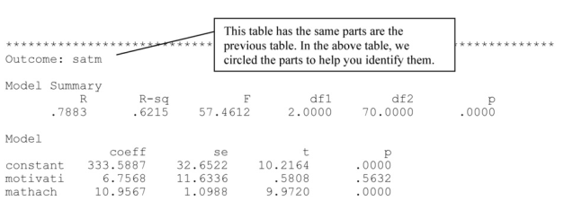 The next part of the output shows information from the regression with the independent variable (math achievement) predicting the mediating variable (motivation). The Model Summary information shows that the multiple correlation coefficient (R) is .32 and R2 = .10, this indicates that math achievement explains 10% of the variance in motivation. The F, dfs, and p are similar to the information in an ANOVA table. The F = 7.88 and is statistically significant (p = .006). This indicates that math achievement statistically significantly predicts motivation.