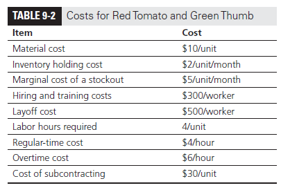 We start by considering the base case discussed in Chapter 8. Each tool has a retail price of $40. Red Tomato ships assembled tools to Green Thumb, where all inventory is held. Green Thumb has a starting inventory in January of 1,000 tools. At the beginning of January, Red Tomato has a workforce of 80 employees at its manufacturing facility in Mexico. There are 20 working days in each month, and Red Tomato workers earn the equivalent of $4 per hour. Each employee works eight hours on normal time and the rest on overtime. Because the Red Tomato operation consists mostly of hand assembly, the capacity of the production operation is determined primarily by the total labor hours worked (i.e., it is not limited by machine capacity). No employee works more than 10 hours of overtime per month. The various costs are shown in Table 9-2.