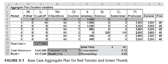 For the base case, we set cell E24 to 0 (no promotion) and use Solver. The optimal base case aggregate plan for Red Tomato and Green Thumb is shown in Figure 9-1 (this is the same as discussed in Chapter 8 and shown in Table 8-4).