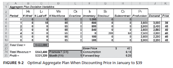 IMPACT OF OFFERING A PROMOTION IN JANUARY The team first considers the impact of offering the discount in January. To simulate this option in the spreadsheet Chapter8,9-examples, enter 1 in cell E24 (this sets promotion to be on) and 1 in cell E25 (this sets the promotion in Period 1—i.e., January). The new forecast accounts for the fact that consumption will increase by 10 percent in January and 20 percent of the demand from February and March is moved forward to January. Thus, with a January promotion, the new demand forecast for January is obtained by adjusting the base case demand from Figure 9-1 and is given by (1,600 X 1.1) + [0.2 X (3,000 + 3,200)] = 3,000 (see Cell J5 in Figure 9-2). The new demand forecast for February is 3,000 X 0.8 = 2,400, and the new demand forecast for March is 3,200 X 0.8 = 2,560. For a January discount, the demand forecast is as shown in cells J5:J10 of Figure 9-2. The optimal aggregate plan is obtained by running Solver in the spreadsheet and is shown in Figure 9-2. With a discount in January, the supply chain obtains the following: