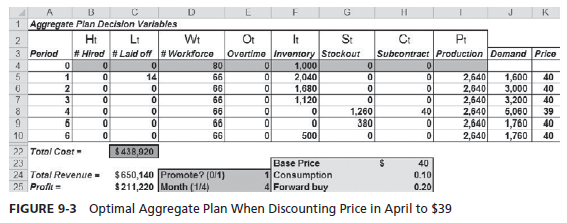 Exactly as discussed earlier, the optimal aggregate plan and profitability can also be determined for the case in which the unit price is $31 (enter 31 in cell H23) and the discounted price is $30. The results of the various instances are summarized in Table 9-3.