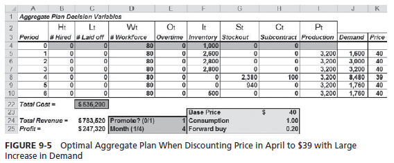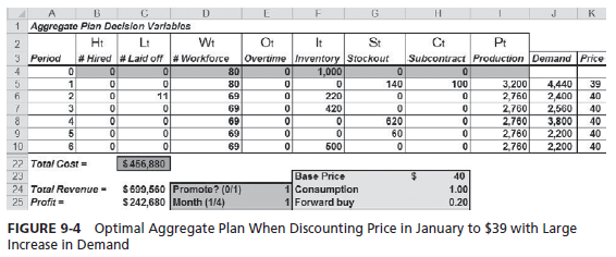 IMPACT OF OFFERING A PROMOTION IN APRIL Now, management considers the impact of offering the discount in April. To simulate this option in the spreadsheet Chapter8,9-examples, enter 1 in cell E24 (this sets promotion to be on) and 4 in cell E25 (this sets the promotion in Period 4—i.e., April). If Green Thumb offers the discount in April, the demand forecast is as shown in cells J5:J10 of Figure 9-3. The optimal aggregate plan is obtained by running Solver and is shown in Figure 9-3. Compared with discounting in January (Figure 9-2), discounting in April requires more capacity (in terms of workforce) and leads to a greater buildup of seasonal inventory and larger stockouts because of the big jump in demand in April. With a discount in April, we have the following: