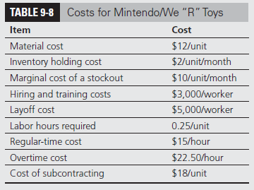 We “R” Toys sells Game Girls for $50 apiece. At the end of June, the company has an inventory of 50,000 Game Girls. Capacity of the production facility is set purely by the number of workers assembling the Game Girls. At the end of June, the company has a workforce of 300 employees, each of whom works 8 hours of regular time at $15/hour for 20 days each month. Work rules require that no employee work more than 40 hours of overtime per month. The various costs are shown in Table 9-8.