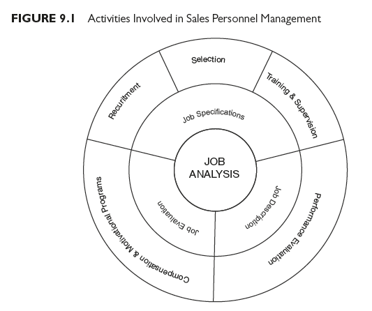 The steps in sales force management are the same as those in general personnel management. Sales force management work, as shown in Figure 9.1, starts with job analysis—determining the job objectives, the component duties and responsibilities, performance criteria, and reporting relationships. The output of job analysis is the written job description that is used in deriving the necessary qualifications (job specifications) of the employee. Qualified job applicants must be found, and this requires decisions on recruiting sources and methods. From the supply of applicants, those meeting the job specifications are selected. After hiring, applicants undergo initial training and throughout their entire careers with the company—receive continuing training through diverse delivery systems. Compensation plans are designed to provide appropriate levels and methods of compensation.