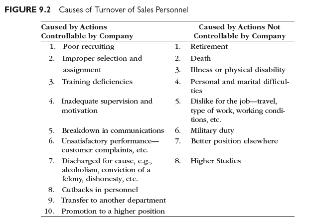The personnel turnover rate is analyzed periodically to determine the causes. Analysis often uncovers areas where improvement is needed. A useful information source is an exit interview between the departing salesperson and either a line executive or a personnel consultant. This interview provides an opportunity to identify conditions contributing to personnel turnover. Identification enables management to modify or correct conditions within its control.