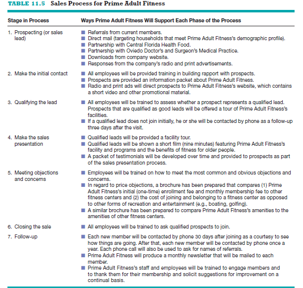 Some firms implement their sales strategy by listing the seven steps in the process, and then writing procedures for how each step will be implemented. In fact, some new ventures include this material in their business plan, to provide the reader confidence that they’ve thought through how they’ll close sales. An example of a sales process, with accompanying action steps, for a fictitious business named Prime Adult Fitness is shown in Table 11.5. The ex- ample comes from the book Preparing Effective Business Plans, Second Edition, by Bruce R. Barringer (co-author of this book). Prime Adult Fitness is a fitness center for people 50 years old or older. Its mission is to make exercise and fitness a vibrant and satisfying part of the lives of people who are 50 years old and older. The company will start with a single fitness center located in Oviedo, Florida, a suburb of Orlando. The steps shown in Table 11.5 outline the process the company will use to recruit members and is the method that the in-house staff will follow when people walk into the center and inquire about membership. At times the process will take weeks to unfold, for example if Prime Adult Fitness employees have multiple contacts with a prospect, and at times the process will take only a few minutes, such as when an employee provides a prospect a tour of the facility and answers specific questions. Prime Adult’s sales process is offered only as an example. Individual firms can use this example as a template for developing a sales process that fits their indi- vidual products and circumstances.