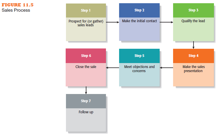 Some companies simply wing it when it comes to sales, which isn’t recom- mended. It’s much better to have a well-thought-out approach to prospecting customers and closing sales. A formal sales process involves a number of iden- tifiable steps. Although the process varies by firm (and industry), it generally includes seven steps, as shown in Figure 11.5. Following a formal or structured process to generate and close sales benefits a firm in two ways. First, it enables a firm to fine-tune its approach to sales and build uniformity into the process. Second, it helps a firm qualify leads, so the firm can spend its time and money pursuing the most likely buyers of its products or services. The most frustrat- ing thing a salesperson encounters is spending time and effort working with a potential buyer, only to find that the buyer doesn’t have the money or the au- thority to make a purchase. A well-thought-out sales process has triggers in it that help a salesperson discern whether spending time with a particular pros- pect is a good use of his or her time.