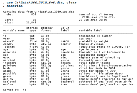 This question has two kinds of missing values. About 5% of the respondents were asked the marijuana question but said they did not know, or declined to give an answer. Their missing values have been coded .a, with value label “DK”. Another 35% in this sample were not asked the grass question. Those have been coded .b, with value label “NA”. The GSS accommodates a large number of questions by asking different questions to subsets of their sample. Analytically it makes sense for us to set aside the un-asked group and recalculate the percentages. Doing so, we find an even split: about 46% in favor and 46% opposed to legalizing marijuana, with 8% undecided.