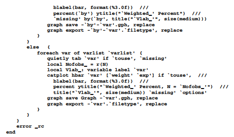 Indentation of lines has no effect on the program’s execution, but makes it easier for the programmer to read. The heart of multicat is its syntax statement, and then a foreach loop that repeatedly calls catplot for each variable in the variable list. Local macros pass information to the catplot command that actually draws the graphs. The command allows analytical weights (aweights) which have an effect here similar to that of probability weights (pweights) in a svy: tab command. It allows in or if qualifiers. Optionally we could include missing values, and use by( ) but not over( ).