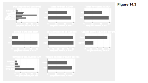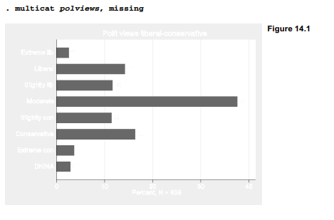 After multicat.ado has been saved (for example, in C:\ado\personal), the command multicat becomes usable as if it were an ordinary (albeit, unfinished) feature of Stata. Figure 14.1 shows responses regarding political views. Both percentages and the number of observations appear in the plot.