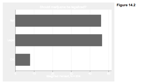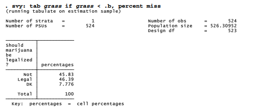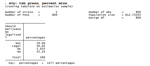 Survey data commonly are analyzed using probability weights and svyset data, as discussed in Chapter 4. Applying survey weights, svy: tab finds the following responses to the question about legalizing marijuana.