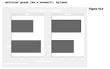 multicat (based on catplot) does not understand svy: commands or probability weights, but analytical weights (aweights) have the same effect here. Figure 14.2 shows a multicat plot corresponding to the table above. The multicat graphic also notes the relevant sample size (524).