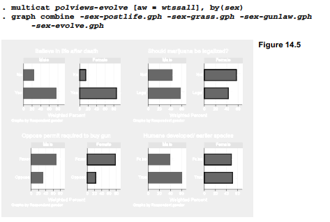The graph combine step is used in Figures 14.3 and 14.5 for compact illustrations of what multicat is doing. In research, the actual number of graphs often exceeds what we want to crowd into one image. A multicat command could just as easily draw 100 graphs comparing survey responses by men and women, then 100 more comparing responses by education level, age group, political party, region or any other categories of interest. Most analysts will never need this particular trick, but when specialized needs arise in a project, makeshift programs of this sort could become essential.