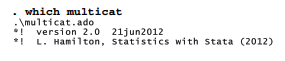 The program could be refined further to make it more flexible, elegant and user-friendly. Note the inclusion of comments stating the source and “version 2.0” in the first two lines, which both begin *! The comment refers to version 2.0 of multicat.ado, not Stata (an earlier version of multicat.ado appeared in the previous edition of this book). The Stata version suitable for running this program is specified by the version 12.1 command a few lines later. Although the *! comments do not affect how the program runs, they are visible to a which command:
