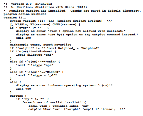 The program could be refined further to make it more flexible, elegant and user-friendly. Note the inclusion of comments stating the source and “version 2.0” in the first two lines, which both begin *! The comment refers to version 2.0 of multicat.ado, not Stata (an earlier version of multicat.ado appeared in the previous edition of this book). The Stata version suitable for running this program is specified by the version 12.1 command a few lines later. Although the *! comments do not affect how the program runs, they are visible to a which command: