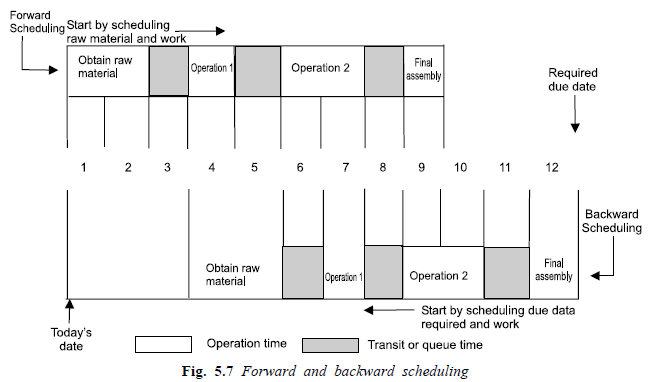 - Backward scheduling is often used in assembly type industries and commit in advance to specific delivery dates. Backward scheduling determines the start and finish times for waiting jobs by assigning them to the latest available time slot that will enable each job to be completed just when it is due, but done before. By assigning jobs as late as possible, backward scheduling minimizes inventories since a job is not completed until it must go directly to the next work centre on its routing. Forward and backward scheduling methods are shown in Fig. 5.7.