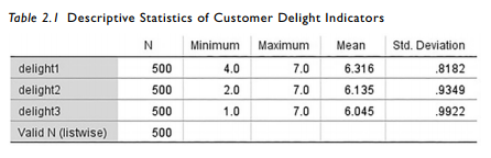 The descriptives output (listed below) lets you see the minimum and maximum value for each indicator. With all three indicators on a 7-point scale, the maximum value should not be below 1 or higher than 7. With some online survey companies, I have actually seen where data from the company is converted to other numbers. Instead of a 1 to 7 scale, the software changes the scale to a 14 to 20 scale.This is rare, but in the event something like this does hap- pen, you will know what analysis to use to catch this impermissible response.