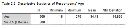 The results of the analysis show us the minimum age was 18 and maximum age was 270. Unless Dorian Gray was one of the respondents, the 270 record is most likely respondent error. Based on the mean, the respondent was probably 27 but could be 70. In this instance, it is better to delete the record and then impute the missing data. As stated earlier, this analysis will let you see if any of your values are outside of an accepted range. Failing to address this issue could significantly skew your data depending on the sample size.
