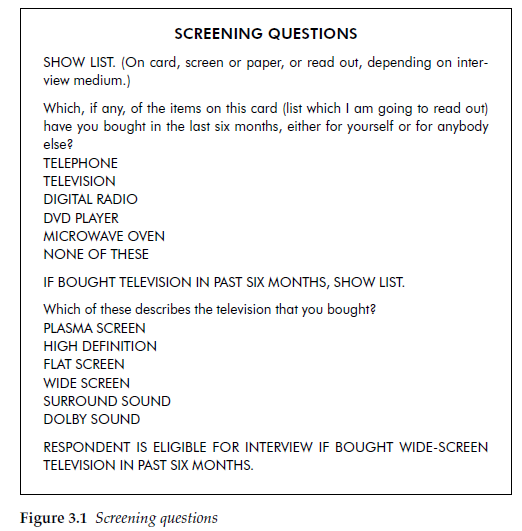 It is not good practice to ask, for example, ‘Have you bought a widescreen television in the last six months?’, as respondents’ reasons for answering ‘yes’ or ‘no’ may have little to do with whether they actually have or not. A less biased version of the question is given in Figure 3.1.