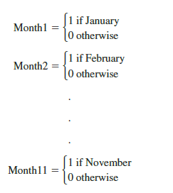 In the preceding smartphone sales example, we showed how dummy variables can be used to account for the quarterly seasonal effects in the time series. Because there were 4 levels for the categorical variable season, 3 dummy variables were required. However, many businesses use monthly rather than quarterly forecasts. For monthly data, season is a categorical variable with 12 levels and thus 12 – 1 = 11 dummy variables are required. For example, the 11 dummy variables could be coded as follows:
