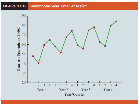 Let us now extend the regression approach to include situations where the time series contains both a seasonal effect and a linear trend by showing how to forecast the quarterly smartphone sales time series introduced in Section 17.1. The data for the smartphone time series are shown in Table 17.18. The time series plot in Figure 17.18 indicates that sales are lowest in the second quarter of each year and increase in quarters 3 and 4. Thus, we conclude that a seasonal pattern exists for smartphone sales. But the time series also has an upward linear trend that will need to be accounted for in order to develop accurate forecasts of quarterly sales. This is easily handled by combining the dummy variable approach for seasonality with the time series regression approach we discussed in Section 17.3 for handling linear trend.