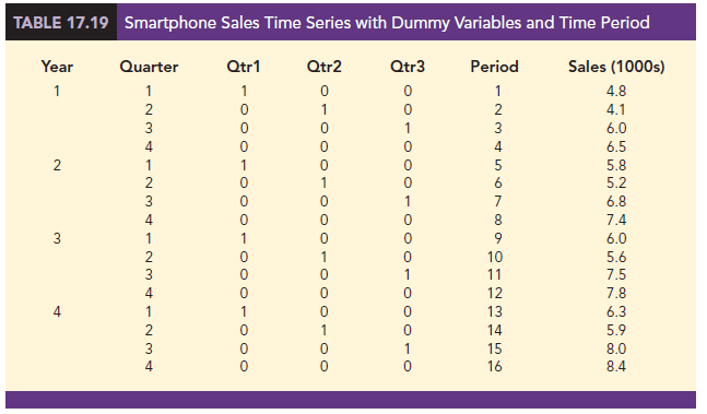 Table 17.19 is the revised smartphone sales time series that includes the coded values of the dummy variables and the time period t. Using the data in Table 17.19, we obtained the computer output shown in Figure 17.19. The estimated multiple regression equation is
