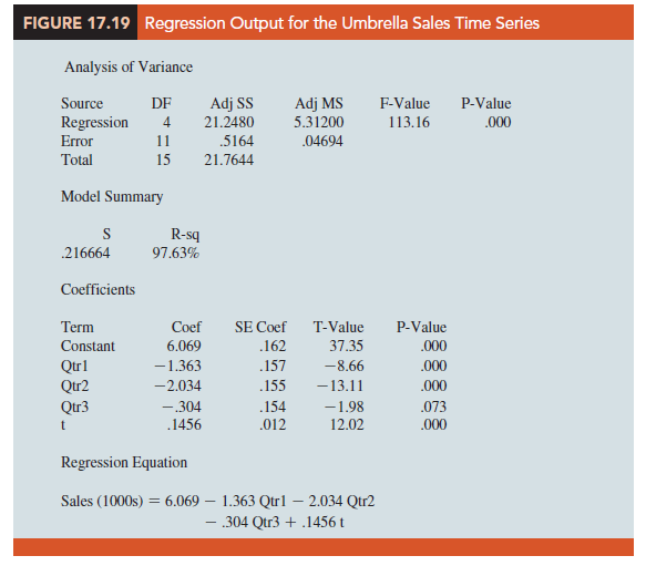 Table 17.17 is the umbrella sales time series with the coded values of the dummy variables shown. Using the data in Table 17.17, we obtained the computer output, a portion of which is shown in Figure 17.17. The estimated multiple regression equation obtained is