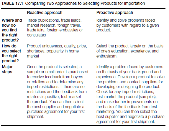- Importing the appropriate product for the market requires the development of the requisite infrastructure (product design, registration of patents, selection of the best suppliers, and access to distribution channels). Such an investment of financial resources, time, and effort is inconceivable using the reactive approach because efforts invested to start one product are wasted when one begins to quickly replace it with another product (Table 17.1).