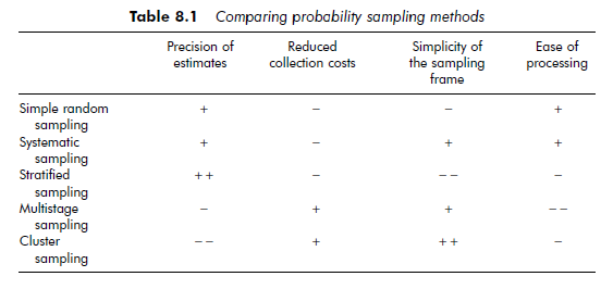 We should make it clear that these different sampling methods are not necessarily mutually exclusive. For instance, depending on the purposes of the study, multistage sampling might be combined with stratified sampling, the primary units being selected at random and the elements of the sample being selected into the primary units by the stratification method. One can also, for example, stratify a population, and then select clusters of elements within each stratum. This type of combination can raise the precision level of the estimations, while at the same time taking practical constraints into account (whether or not a comprehensive sampling frame exists, the available budget, etc.). Table 8.1 presents the advantages and disadvantages of each of these probability sampling methods.