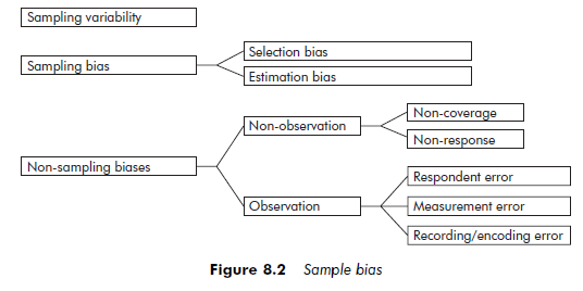 Sample biases can affect both the internal and the external validity of a study. There are three categories of biases: sampling variability, sampling bias and non-sampling bias (although sampling variability and estimator’s bias affect probability samples only). The sum of these three biases is called the total error of the study (see Figure 8.2).