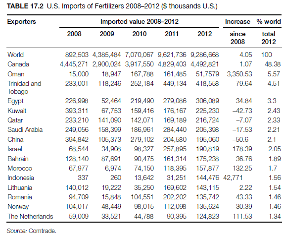 Step 3: You see that U.S. imports in fertilizers are growing by about 4 percent a year. Note that imports do not always determine market potential. A product can always be adapted to suit the market. The data shows that Indonesia, Oman, and Israel have been gaining market share over suppliers from other countries. You can also inquire about prices and quality.