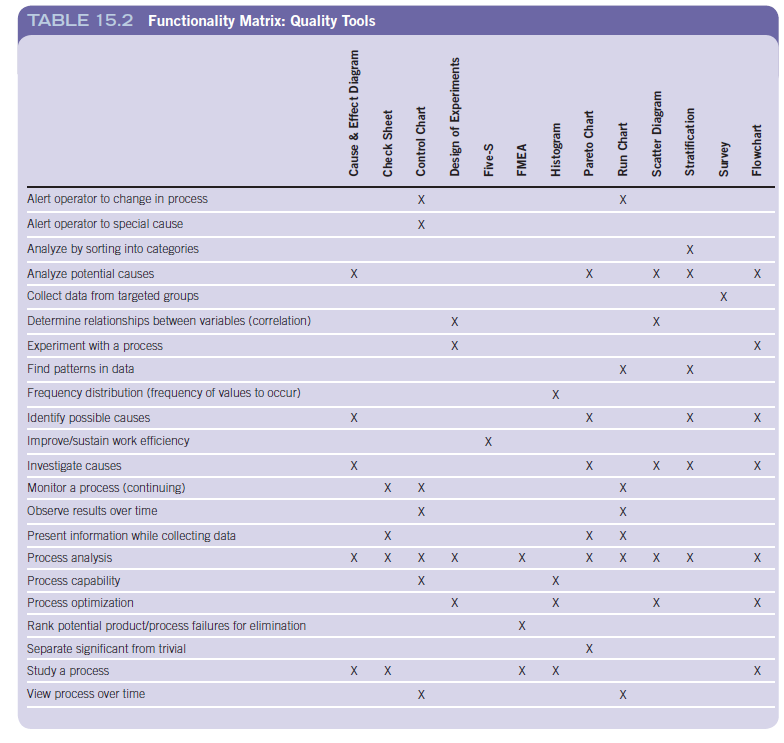 In this chapter, we have discussed 13 quality tools, some in great detail and a few on an introductory basis. Your challenge will be selecting the appropriate tool (or tools) for the task at hand. This can be confusing, especially at first. For that reason, we have included Table 15.2, a functionality matrix for the tools. It is by no means complete in terms of the possible uses of the tools or tasks that may be required, but it illustrates the common functionality of our tools. For example, if your task is to obtain data from a group of customers, the matrix will point you to the survey. If you are looking for something that will provide useable information in graphic form even as the data are being collected, then the matrix suggests a check sheet, Pareto chart, or run chart. Your selection will be determined by which tool you think will best satisfy your requirement. Note that most of the tools are useful in more than one situation. Your knowledge of the task will often make the selection clear, although there may also be some trial and error involved initially. The matrix is intended to illustrate the kinds of functions that may be appropriate for the tools. Once you start using them, you will find the selection to be virtually automatic.
